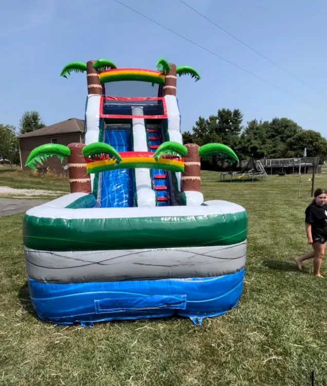 Our 18 Foot Blue Palm Tree Double-Decker Slide is designed for maximum fun and safety. With its vibrant blue color and palm tree motif it will instantly transport your guests to a tropical paradise. The double-decker design adds an extra element of thrill making it a unique and exciting option for your event.