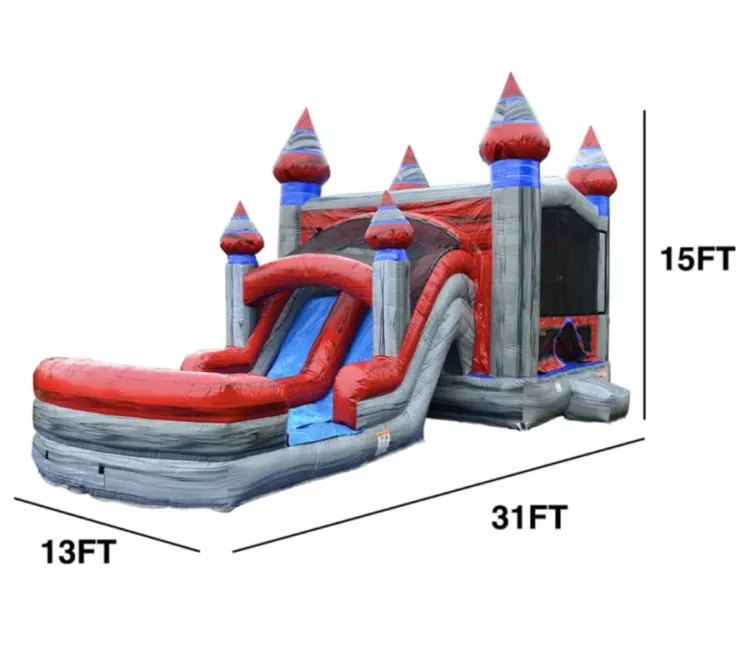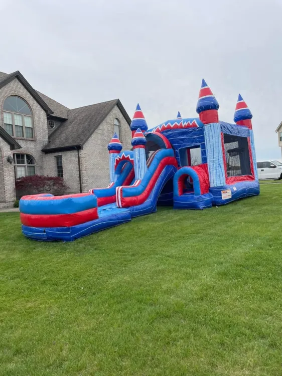 One of the newest and possibly coolest inflatable bounce house and slides we have added to our inventory. You have to check out this marbled castle themed jump house with slide attached to really appreciate it. It features a cool red and blue design with castle pillars and a slide; PLUS you can use this unit wet or dry making it the perfect party rental for any birthday party "backyard" bbq get-together church event or even school events.