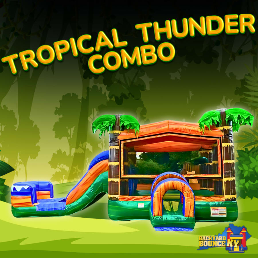 Whether you're hosting a birthday party, company picnic, or backyard barbecue, the Tropical Thunder Slide Combo is sure to be a hit with guests of all ages. It's easy to set up and can be used both indoors and outdoors, providing endless entertainment no matter the location.